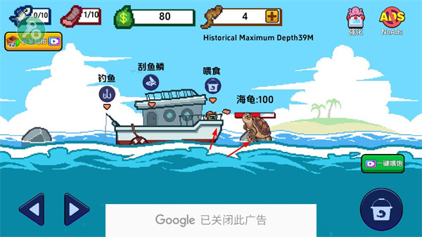 3、在漁船界面,參與釣魚、刮魚鱗、喂食海龜?shù)炔僮?,豐富游戲內(nèi)容,同時積累資源為經(jīng)營發(fā)展奠定基礎(chǔ)。