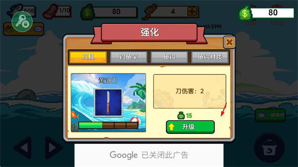 4、進入強化界面,花費資金升級刀具、釣魚竿等裝備,優(yōu)化工具性能,助力游戲進程。