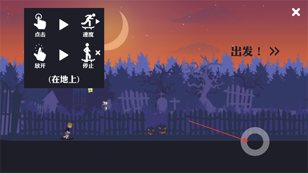 1、進入游戲,查看操作提示,在地面時,點擊屏幕操控角色加速,松開停止,點擊右側圓環(huán)可開始游戲。