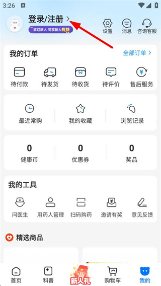 3、在個人中心頁面,點(diǎn)擊登錄/注冊,進(jìn)入登錄注冊選擇頁面。