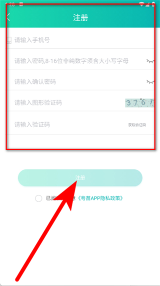 4、填寫手機號、密碼、圖形驗證碼、驗證碼等信息,勾選協議后點擊注冊。