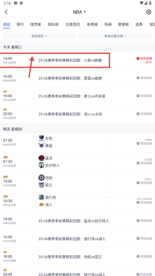4、在NBA賽事詳情頁,查看具體賽事如25-26賽季季前賽精彩回顧:火箭vs鵜鶘,了解賽事信息。