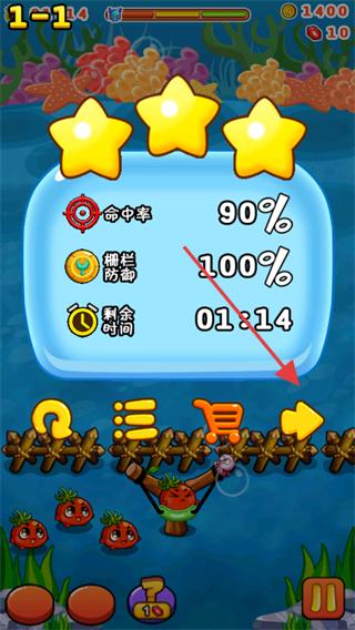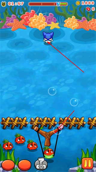 2、進入關卡后,將手指放在蔬菜角色上,點擊發(fā)射按鈕,瞄準出現(xiàn)的藍色小怪獸,對其進行攻擊。