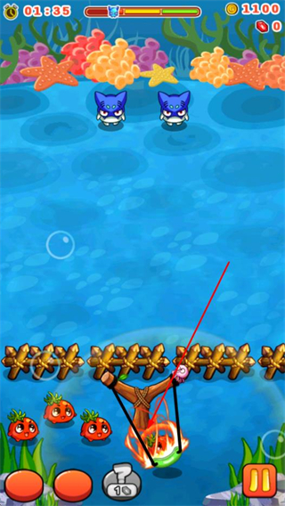 燃燒的蔬菜2是一款休閑塔防類游戲,以海洋為背景打造,畫面色彩鮮艷且豐富,海浪、珊瑚等各類海洋元素巧妙點綴其中,視覺效果十分出色,玩家操控造型可愛的蔬菜角色,借助發(fā)射道具的方式,抵御如藍色小怪獸、帶殼軟體怪這類不同類型敵人的進攻。