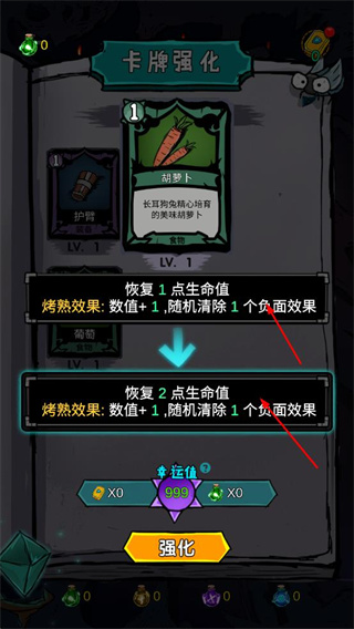 1、進入卡牌強化界面,花費資源強化卡牌,提升其恢復(fù)生命值等效果,增強角色能力。