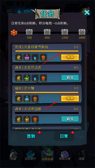 2、完成主線章節(jié)挑戰(zhàn)、強化卡牌等日常任務(wù)后,點擊領(lǐng)取按鈕獲取獎勵,積累資源用于游戲發(fā)展。
