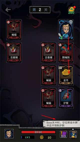3、在boss關(guān)卡中,利用空位移補牌機制,合理搭配卡牌應(yīng)對敵人,同時收集金幣、護臂等資源。
