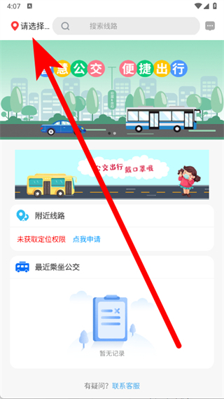 1、打開公交e出行,點(diǎn)擊頁面左上角請選擇,完成城市選擇設(shè)置。