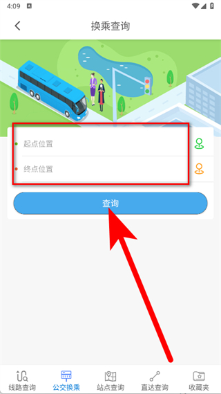 4、填寫起點(diǎn)位置和終點(diǎn)位置,點(diǎn)擊查詢按鈕,就能獲取公交換乘方案。