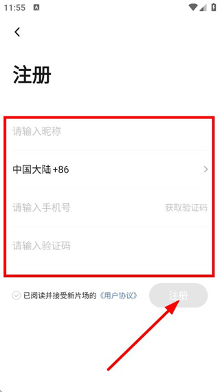 4、在注冊頁面,輸入昵稱、手機(jī)號、驗證碼,點擊注冊,完成注冊操作。