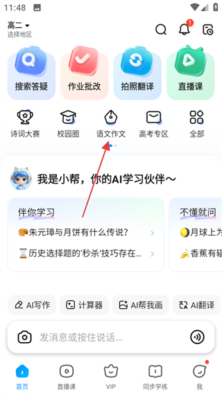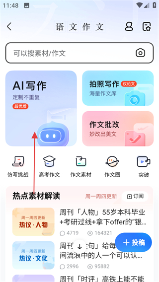 2、在語文作文頁面,點擊AI寫作,進入AI寫作頁面。
