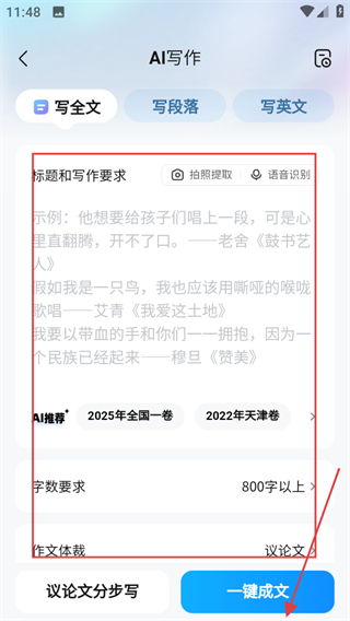 3、在AI寫作頁面,設(shè)置好信息后,點擊一鍵成文,生成作文內(nèi)容。