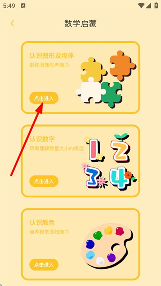2、在數(shù)學(xué)啟蒙頁(yè)面,點(diǎn)擊認(rèn)識(shí)圖形及物體下方的點(diǎn)擊進(jìn)入,進(jìn)入認(rèn)識(shí)圖形頁(yè)面。