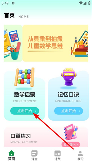 1、在APP首頁(yè),點(diǎn)擊數(shù)學(xué)啟蒙下方的點(diǎn)擊開(kāi)始,進(jìn)入數(shù)學(xué)啟蒙頁(yè)面。