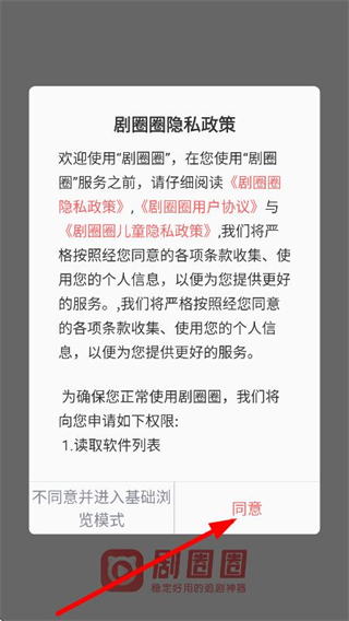 1、在劇圈圈隱私政策彈窗中,點擊同意,進入APP首頁。