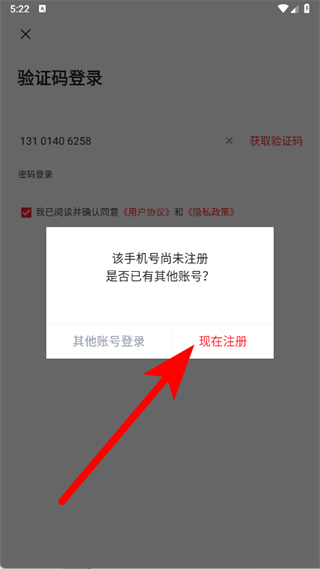 4、若手機(jī)號未注冊,在彈出的提示框中,點(diǎn)擊現(xiàn)在注冊。