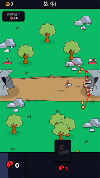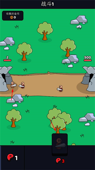 2、戰(zhàn)斗中獲取金幣,用于升級穴居人、提升食物產(chǎn)出速度和基地生命值,為后續(xù)戰(zhàn)斗奠定基礎(chǔ)。