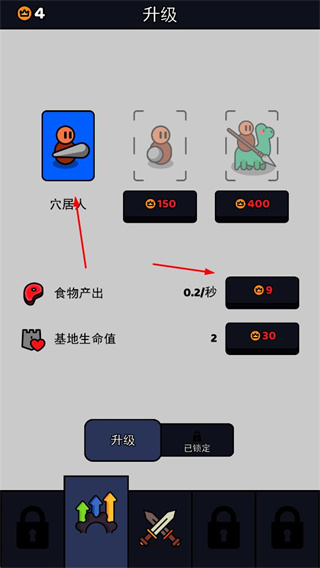 3、在升級界面,花費(fèi)金幣升級穴居人、食物產(chǎn)出和基地生命值,增強(qiáng)戰(zhàn)力與生存能力。