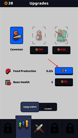 3、在升級(jí)界面,花費(fèi)金幣升級(jí)穴居人、食物產(chǎn)出和基地生命值,增強(qiáng)戰(zhàn)力與生存能力。