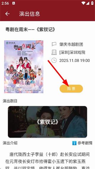 4、在演出信息頁(yè)面,點(diǎn)擊購(gòu)票,可進(jìn)行紫釵記演出購(gòu)票操作。