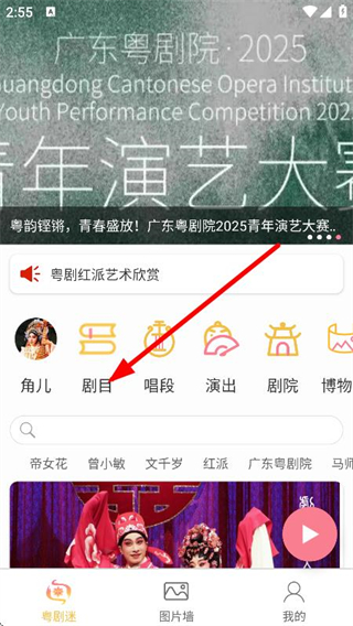 1、在粵劇相關(guān)APP粵劇迷頁(yè)面,點(diǎn)擊劇目,進(jìn)入經(jīng)典劇目頁(yè)面。