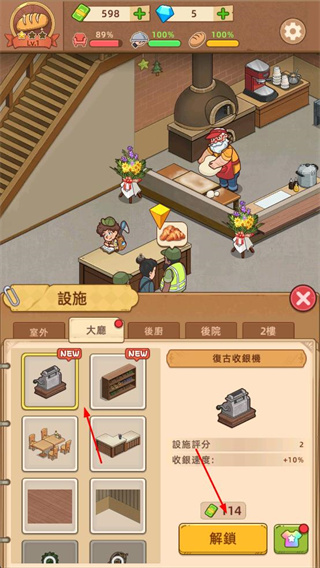 1、在設(shè)施界面解鎖和升級(jí)設(shè)施,提升店鋪裝飾評(píng)分和收銀速度,優(yōu)化經(jīng)營(yíng)環(huán)境。