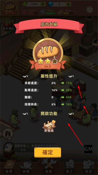 4、店鋪升級(jí)后,提升來(lái)客速度、點(diǎn)單速度等屬性,開放新功能,吸引更多客人,推動(dòng)面包店持續(xù)發(fā)展。