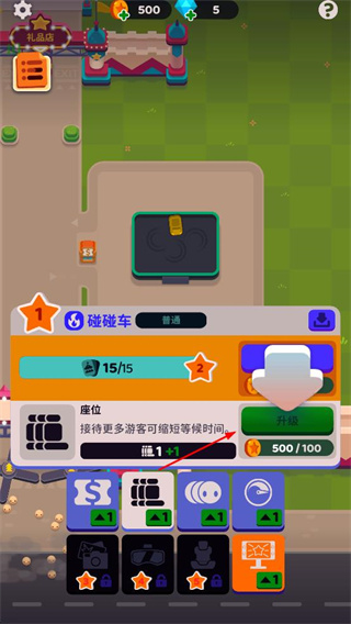 可使用積累的貨幣對已有的游樂設(shè)備進(jìn)行升級,升級后設(shè)備的外觀會更精致,運(yùn)行體驗更優(yōu),還能提升對游客的吸引力,增加游客停留時間。