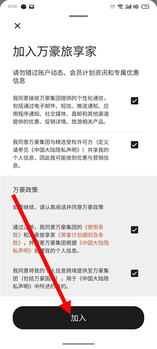 4、下滑頁面,勾選同意相關政策條款后,點擊頁面底部的加入按鈕,完成注冊流程。