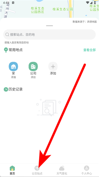 1、打開掌上出行公交,進(jìn)入主界面后,點(diǎn)擊底部導(dǎo)航欄的公交站點(diǎn)選項(xiàng)。