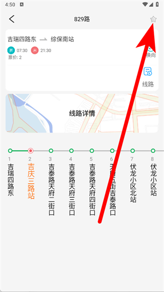 4、進(jìn)入線路詳情頁(yè)面后,可以清晰查看該線路的各個(gè)站點(diǎn)分布、運(yùn)營(yíng)時(shí)間,點(diǎn)擊頁(yè)面右上角的星形圖標(biāo),把這條公交線路收藏起來。
