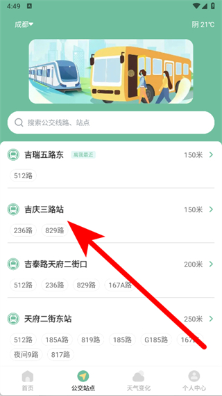 2、在公交站點(diǎn)展示頁(yè)面,列出附近的多個(gè)公交站點(diǎn),挑選你想要查詢的目標(biāo)站點(diǎn)。