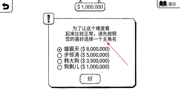 1、看到選擇主角名提示,根據(jù)資金情況,如選狗剩兒,點擊對應(yīng)選項后點好確認。