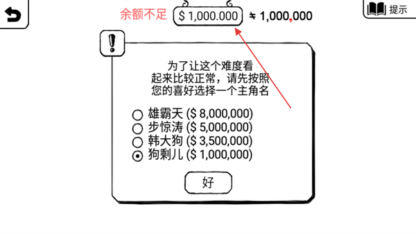 2、若出現(xiàn)余額不足提示,重新審視資金和主角價格,選符合預算的主角。