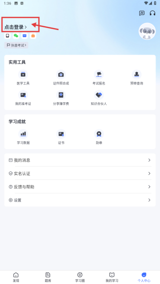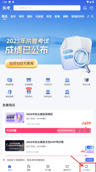 1、打開執(zhí)獸考試類應(yīng)用,點(diǎn)擊底部個人中心選項(xiàng),進(jìn)入個人中心頁面。
