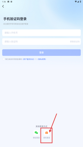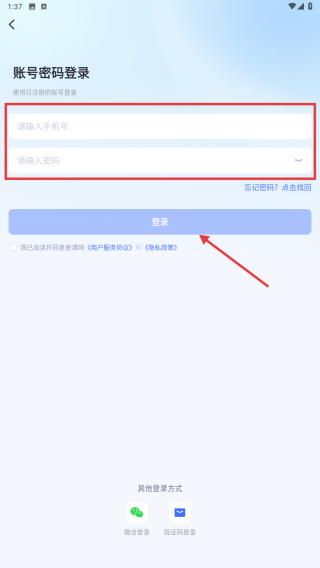 4、在賬號密碼登錄頁面,輸入手機(jī)號和密碼,點(diǎn)擊登錄按鈕,完成賬號登錄操作。