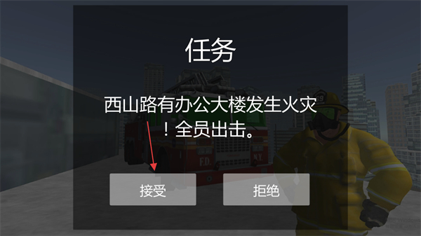 1、游戲中出現(xiàn)任務(wù)提示西山路有辦公大樓發(fā)生火災(zāi)!全員出擊,點(diǎn)擊接受按鈕承接任務(wù)。