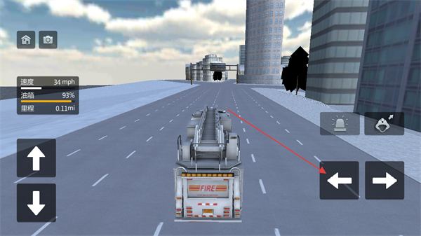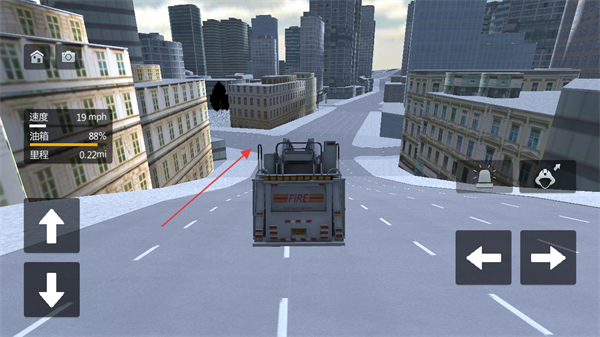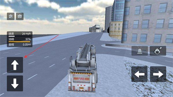 2、通過(guò)屏幕左側(cè)的上下箭頭按鈕控制消防車前進(jìn)或后退,留意速度,油箱,里程等信息。