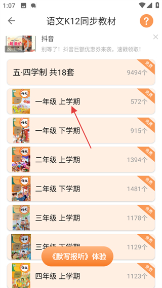 3、在年級(jí)選擇頁(yè)面,點(diǎn)擊一年級(jí)上學(xué)期,進(jìn)入該學(xué)期內(nèi)容頁(yè)面。