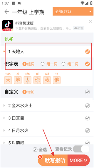 4、在一年級(jí)上學(xué)期內(nèi)容頁(yè)面,選擇要默寫報(bào)聽的內(nèi)容后,點(diǎn)擊默寫報(bào)聽,進(jìn)入默寫報(bào)聽預(yù)覽頁(yè)面。