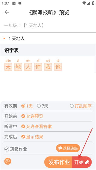 5、在默寫報(bào)聽預(yù)覽頁(yè)面,設(shè)置好有效期等選項(xiàng)后,點(diǎn)擊開始,即可進(jìn)行默寫報(bào)聽。