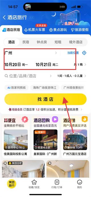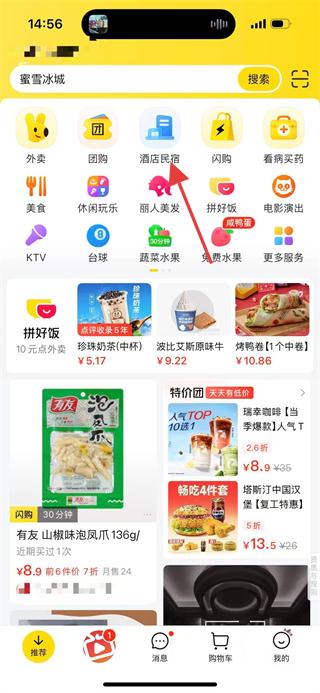 1、進(jìn)入美團(tuán),在首頁點(diǎn)擊酒店民宿,進(jìn)入酒店旅行頁面。
