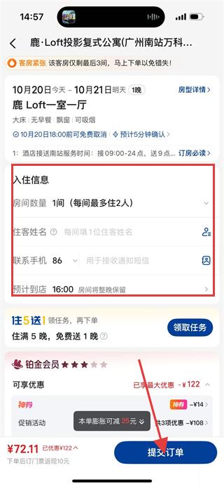 5、在預(yù)訂信息填寫頁面,填寫入住信息后,點(diǎn)擊提交訂單,即可完成酒店預(yù)訂。