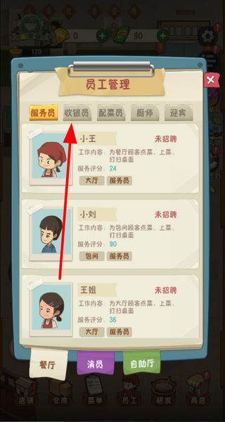 1、進行員工管理,能招聘服務(wù)員、收銀員等不同崗位員工,安排他們?yōu)榭腿颂峁c餐、上菜等服務(wù)。