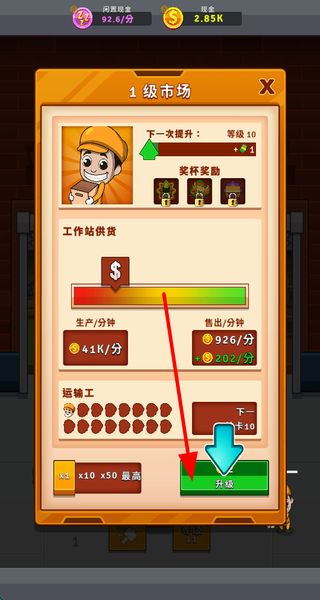 1、消耗金幣升級(jí)市場(chǎng),升級(jí)后能提升生產(chǎn)和售出等效率,還可獲得獎(jiǎng)杯獎(jiǎng)勵(lì),助力發(fā)展。