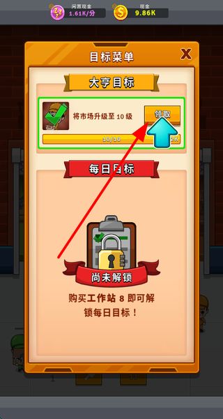 3、完成升級(jí)市場(chǎng)等大亨目標(biāo),可以點(diǎn)擊領(lǐng)取獲取目標(biāo)獎(jiǎng)勵(lì),每日目標(biāo)需解鎖后才能參與。