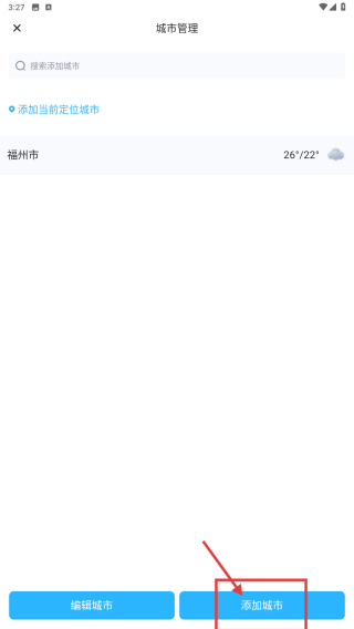 2、在城市管理頁面,點(diǎn)擊添加城市按鈕,進(jìn)入添加城市界面。