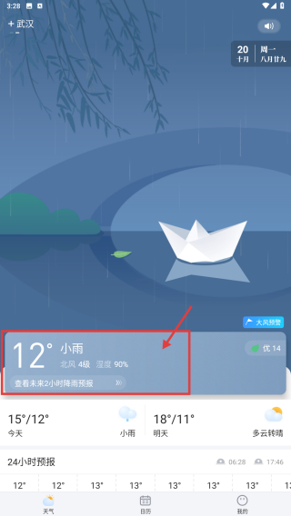 4、添加完成后,查看武漢市的天氣信息,當(dāng)前溫度為12°,天氣小雨,北風(fēng)4級(jí),濕度90%。