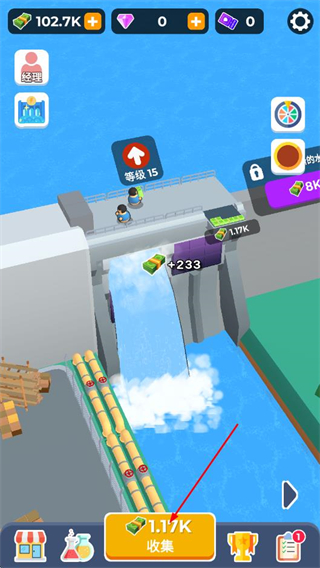 2、進(jìn)入主界面,能看到水壩場(chǎng)景,點(diǎn)擊下方收集按鈕,即可獲取當(dāng)前水壩產(chǎn)生的收益,要及時(shí)收集以積累資金用于后續(xù)發(fā)展。