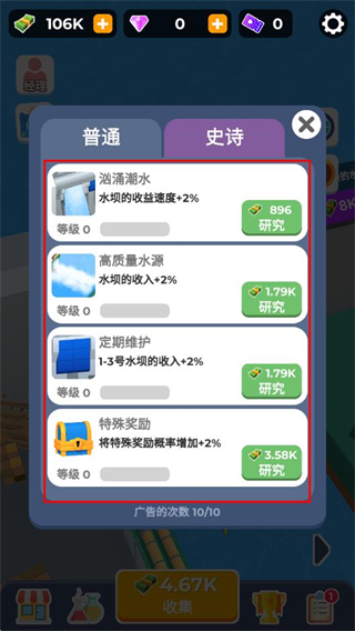 包含升級(jí)水壩、解鎖新水壩、技術(shù)研究等多種經(jīng)營元素,升級(jí)水壩可直接提升收益,解鎖新水壩能拓展經(jīng)營版圖,為玩家打造了一個(gè)充實(shí)且富有策略性的經(jīng)營體驗(yàn)。
